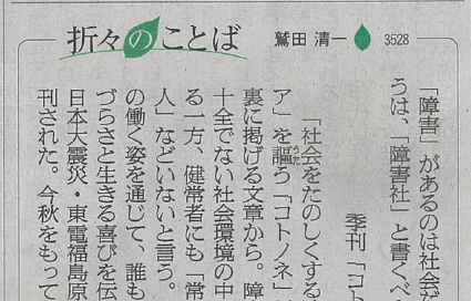 2025年11月24日、25日の2回にわたって、朝日新聞「折々のことば」で、『コトノネ』56号の一節をご紹介いただきました。