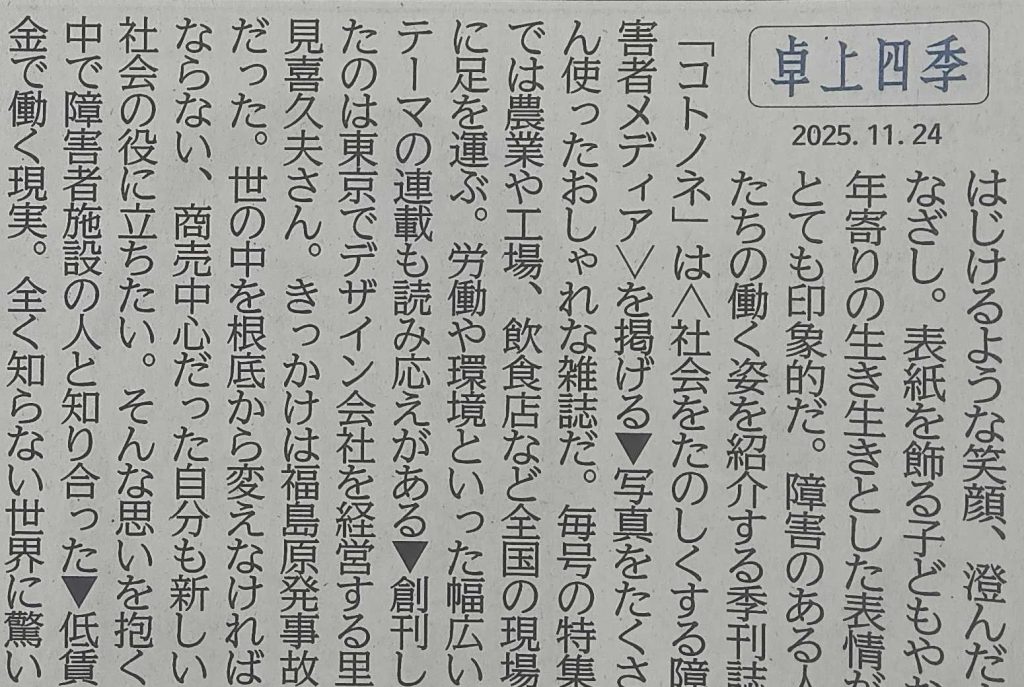 メディア掲載 2025年12月05日 北海道新聞(2025年11月24日)で、『コトノネ』が紹介されました! 2025年11月24日の北海道新聞「卓上四季」で、『コトノネ』が紹介されました。 全文は北海道新聞デジタルから、お読みいただけます。 ぜひご覧ください! 『コトノネ』56号(最終号)の詳細・ご購入は、こちらから。